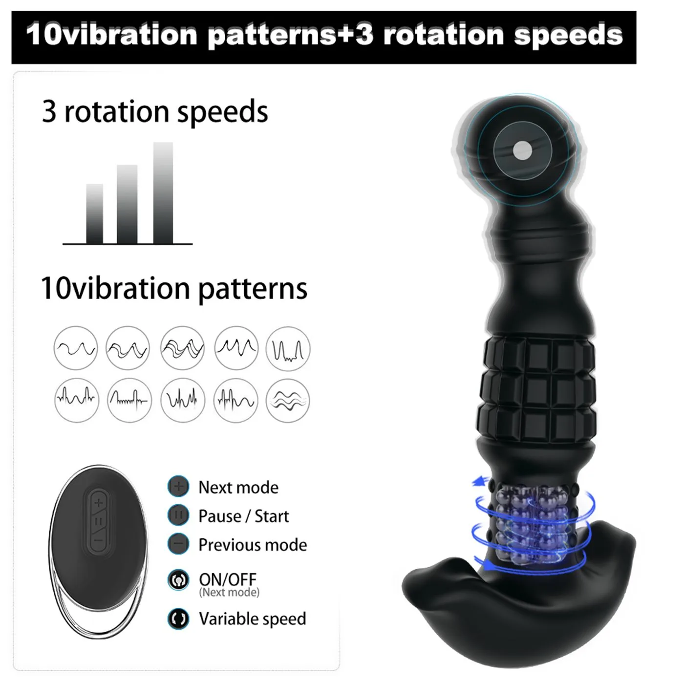Su diseño incluye características que destacan en el mercado, como sus 12 modos de vibración que permiten ajustar la intensidad según tus preferencias, y 3 modos de rotación que ofrecen una estimulación precisa de la próstata. Además, es resistente al agua, permitiendo su uso en la ducha o la bañera para momentos de intimidad aún más relajantes.